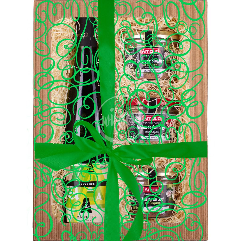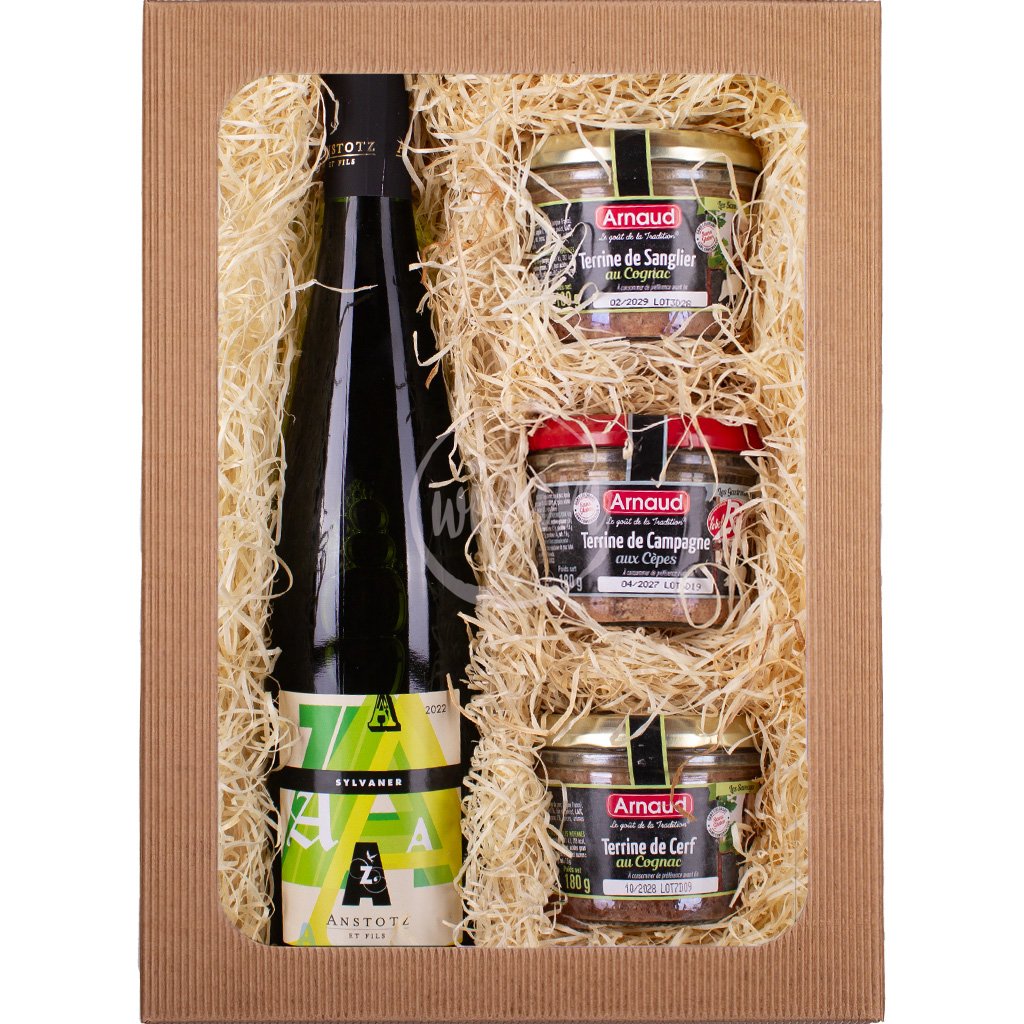Tato dárková kazeta potěší milovníky výrazných chutí - svěží alsaské sylvánské s vůní květů černého bezu, mandarinek, žlutého citrónu a jarních kosatců a s chutí žlutých jablek, meruněk a limetky doplní trio gurmánských delikates z Maison Arnaud: zvěřinové teriny z jeleního masa a z divočáka a s venkovská paštika s hříbky. Ideální dárek k narozeninám.