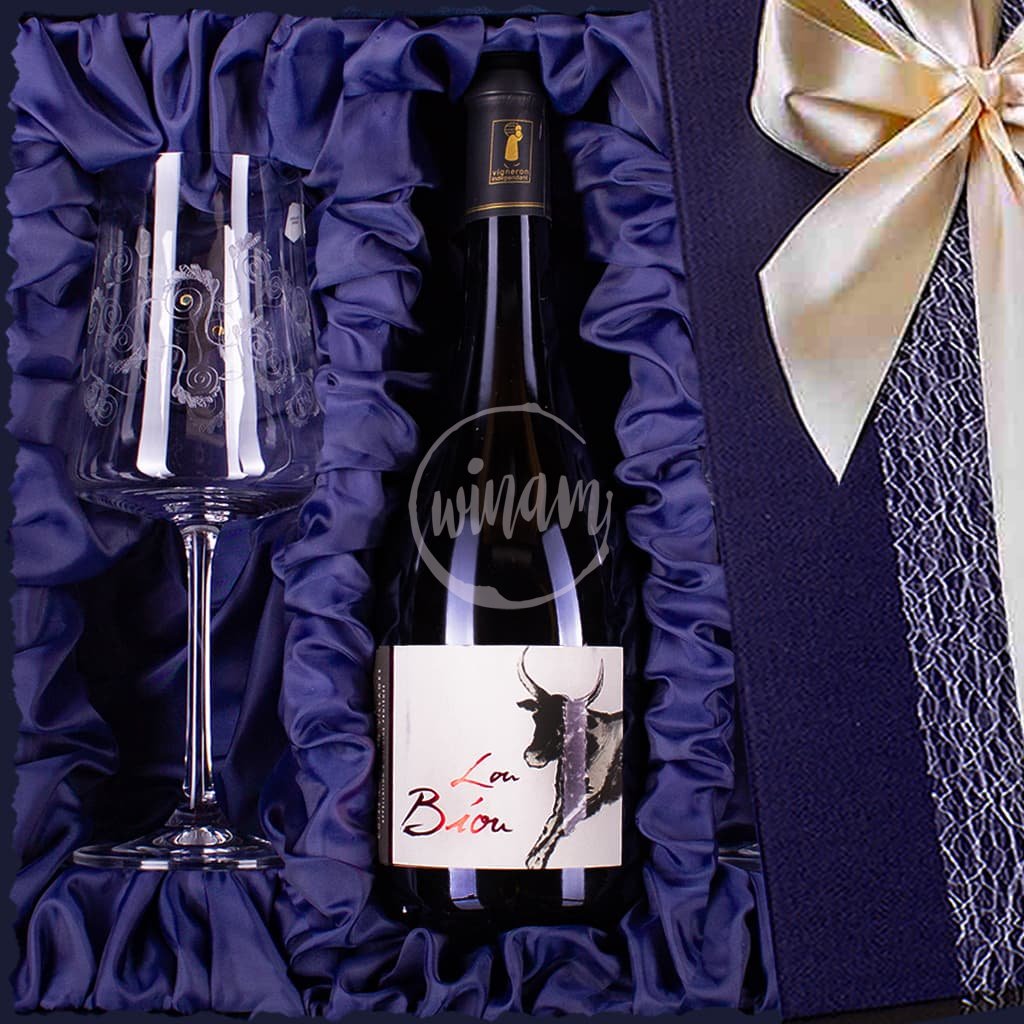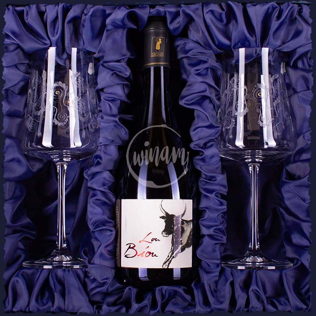 Dárková kazeta je vyrobena z pevného papírového kartonu zvolené barvy, je vyztužena polystyrenovou výplní, kterou zakrývá řasená dekorační textilie. Sklenice i víno jsou pevně zasazeny do polystyrenové výplně tak, aby je chránila proti nechtěnému pohybu při přepravě. Součástí produktu není dárkové zabalení - můžete si jej přiobjednat v příplatkových parametrech ve formě celofánu, dárkového papíru či široké stuhy.