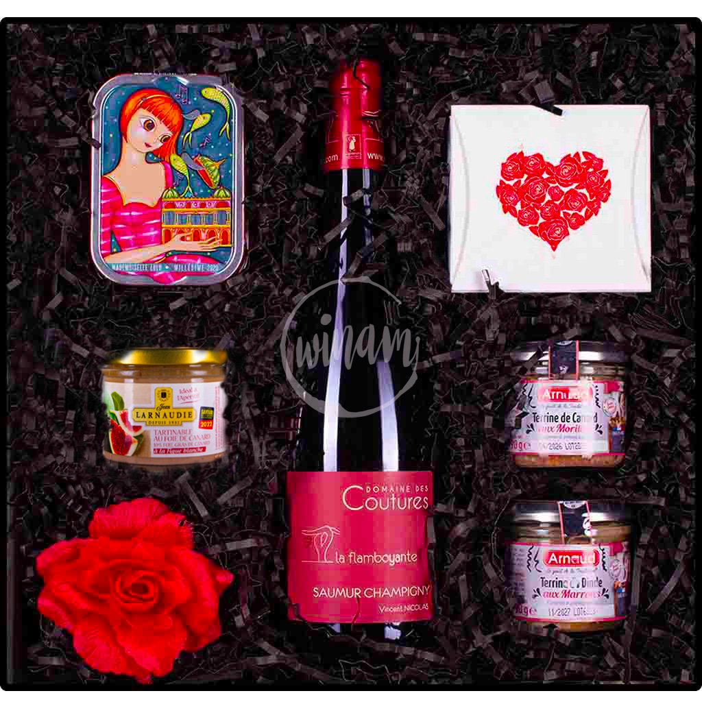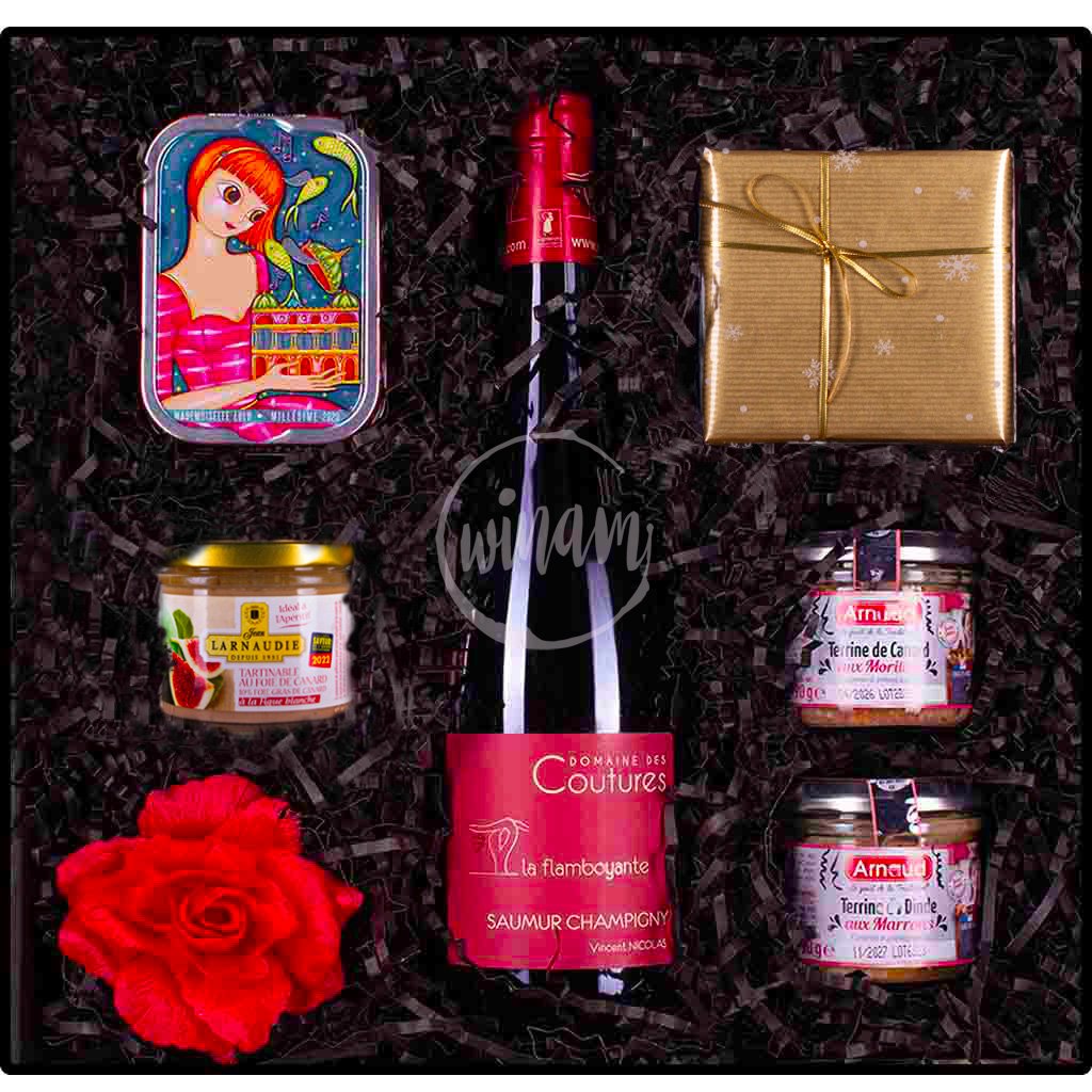 Stylové dárkové balení s červeným vínem a delikatesami