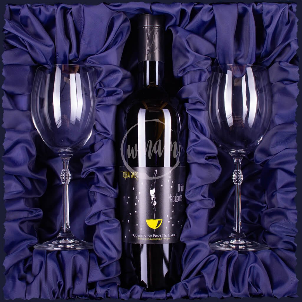 Dárková kazeta je vyrobena z pevného papírového kartonu zvolené barvy, je vyztužena polystyrenovou výplní, kterou zakrývá řasená dekorační textilie. Sklenice i víno jsou pevně zasazeny do polystyrenové výplně tak, aby je chránila proti nechtěnému pohybu při přepravě. Součástí produktu není dárkové zabalení - můžete si jej přiobjednat v příplatkových parametrech ve formě celofánu, dárkového papíru či široké stuhy.