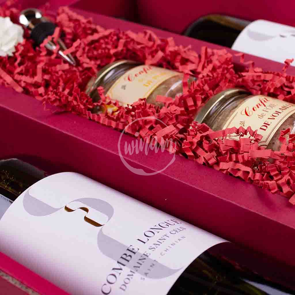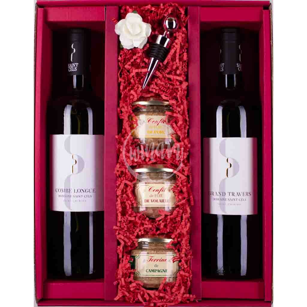 V dárkovém balení najdeme dvojici suchých vín z apleace Saint-Chinian, ve kterém se snoubí tradiční odrůdy oblasti - voňavý Carignan, kořenitý Syrah, bohatý Grenache Noir a animální Mourvèdre u červeného cuvée a strukturovaná Grenache Blanc, aromatická Roussanne a okouzlující Vermentino u bílého cuvéé. Nabízíme s trojicí tradičních francouzských delikates - konfitů z drůbežích a vepřových jater (viz Co je to konfit?) a tradiční vepřovou terinou. Sadu doprovodí okrasná zátka na láhev a něžný bílý květ růže. Znamenitý dárek pro milovníky dobrého jídla a pití.