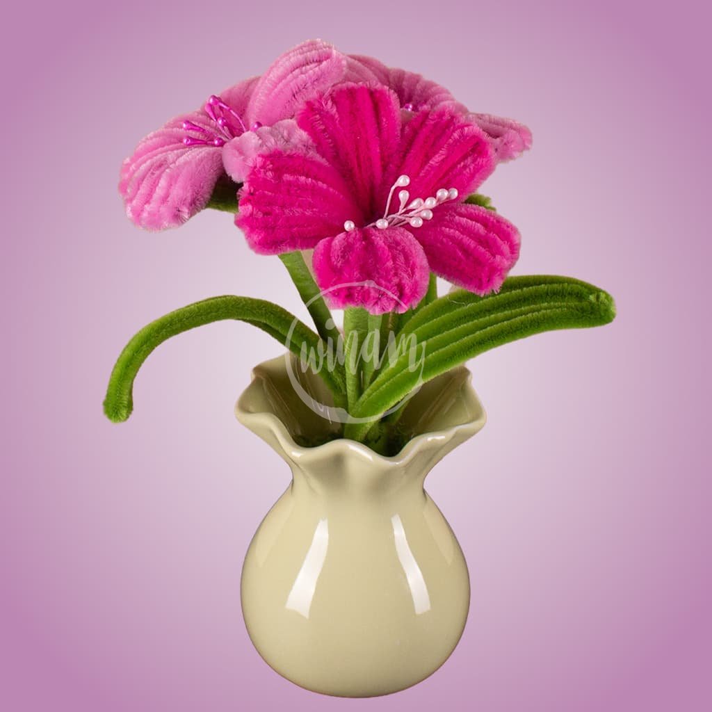 Květina ve tvaru květů růžového ibišku byla ručně vyrobena z barevného umělého nylonového plyše, je velmi hebká a příjemná na dotek. Květina je vložena do keramické vázy slonové barvy. Celková výška cca 21 cm. Oblíbený a něžný dárek nejen pro maminku.