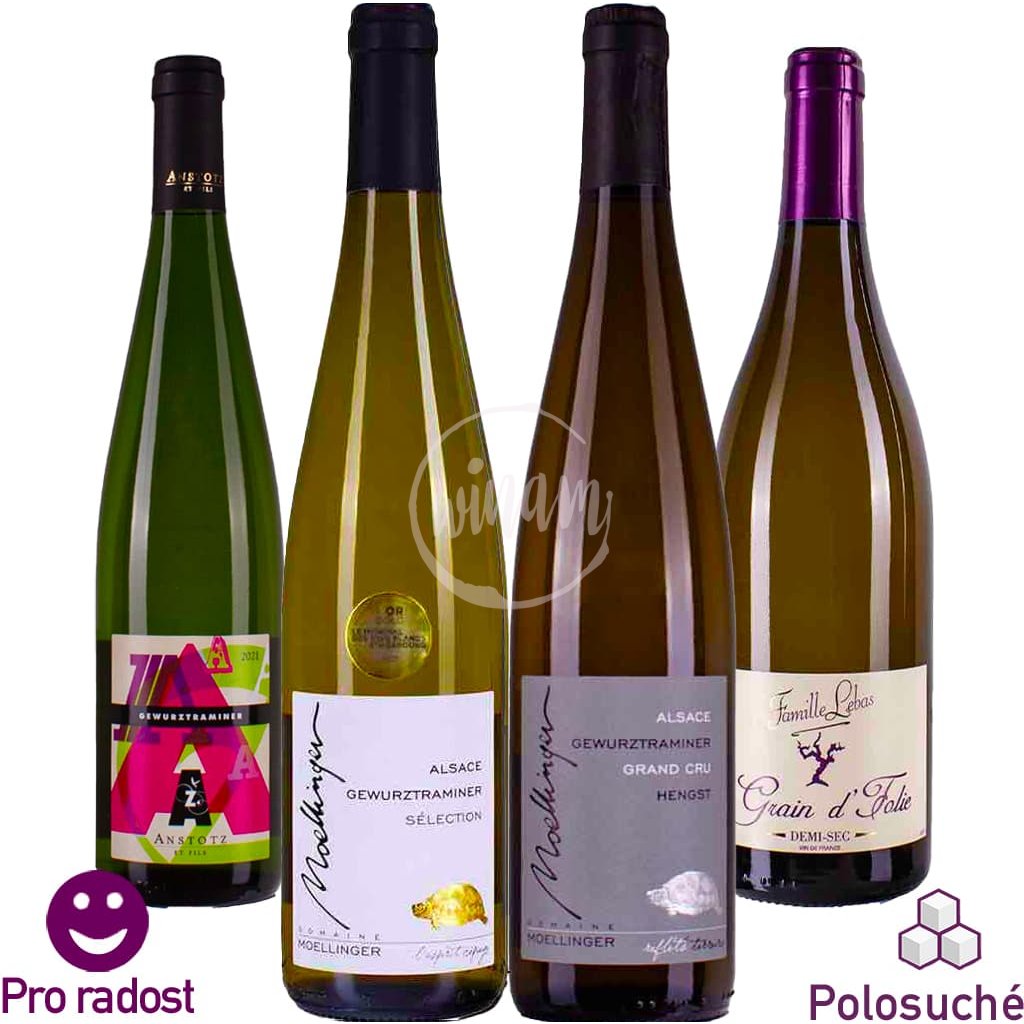 - Co v sadě objevíte: Svěží kulatost a exotickou ovocnost cuvée Grain d'Folie, BIO čistotu a okouzlující vůni růží z vinařství nedaleko Strasbourgu, bohatou aromatičnost klasického Gewurztraminer a majestátní komplexnost Grand Cru Hengst s výjimečným potenciálem zrání vinic u Colmaru