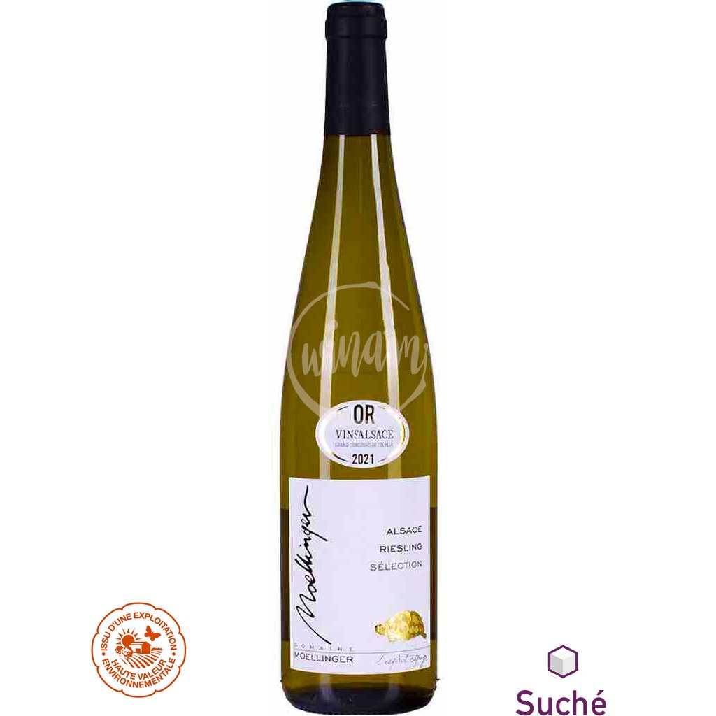 Výběrový Riesling z rodinného vinařství pana Moellingera ze samého srdce Alsaska nedaleko Colmaru je ztělesněním vinařských tradic a terroiru Alsaska. Riesling byl vyroben z ručně sbíraných hroznů, zrál několik týdnů na kvasinkách a poté v tradičním alsaském dubovém sudu zvaném "foudre". Poctivý Riesling s harmonií minerálních a ovocných tónů jak v chuti i vůni: svěží minerální tóny doplní sladká chuť nektarinek, mirabelek, sladkého pomela a pampeliškového medu. Víno má bohaté, plné tělo a dlouhou ovocnou dochuť s tóny pomela a medu. Výborně doprovodí zeleninové pokrmy nebo speciality z drůbeže a ryb. Dokonale samozřejmě ladí s kohoutkem na víně a alsaskými spaeztlemi.