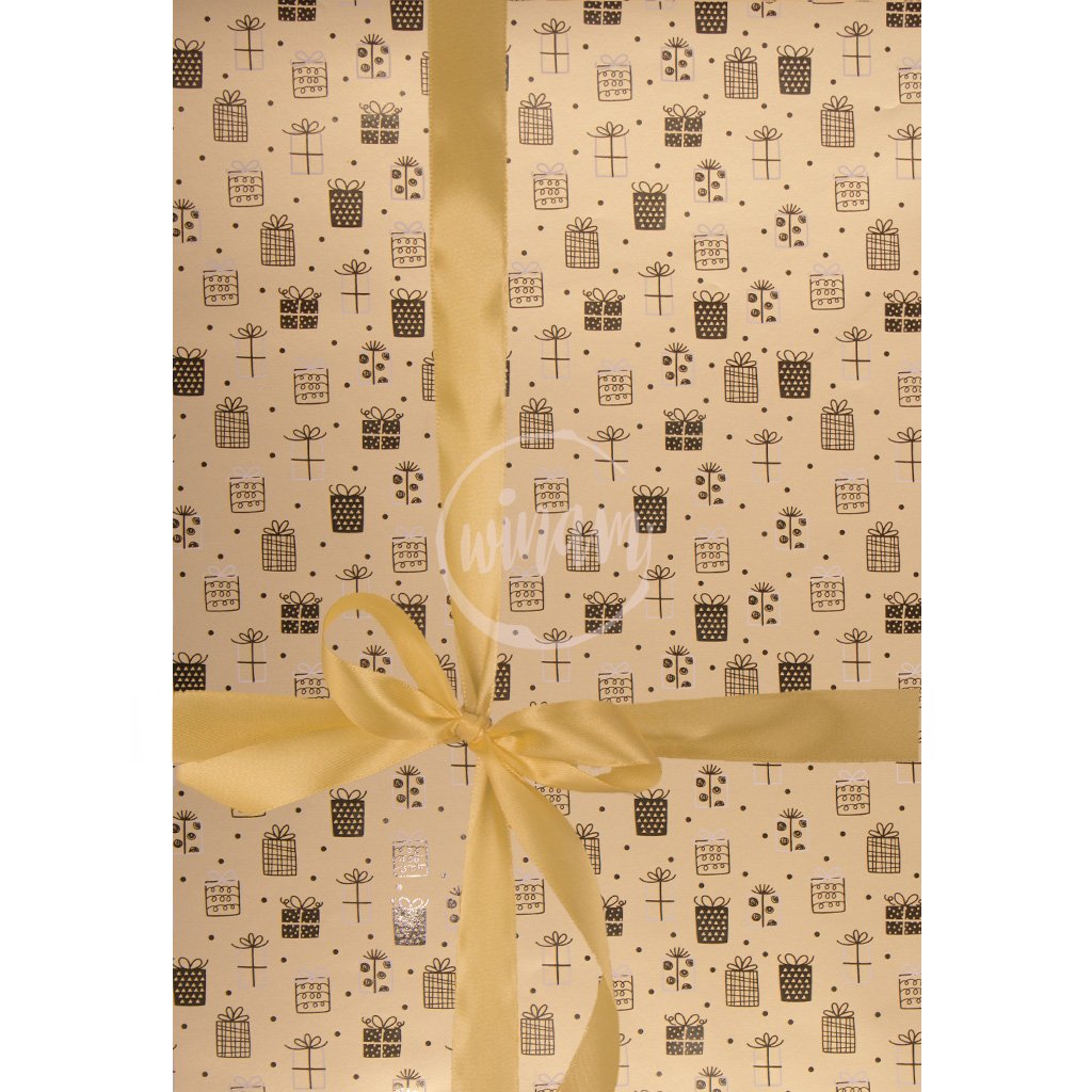 Nabízíme luxusní zlatý balící papír s dekorem drobných lesklých dárečků, doplněných barevnou atlasovou stuhou. Máte-li jasno v barvě stuhy, napište nám svůj požadavek do poznámky v objednávce - pokud bude Vaše barva skladem, rádi vyhovíme!