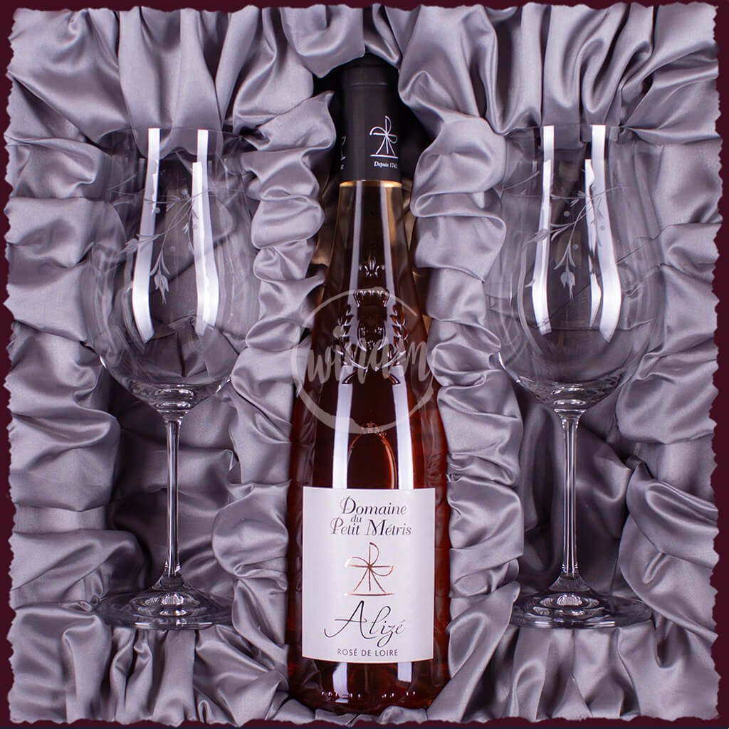 Dárková kazeta je vyrobena z pevného papírového kartonu zvolené barvy, je vyztužena polystyrenovou výplní, kterou zakrývá řasená dekorační textilie. Sklenice i víno jsou pevně zasazeny do polystyrenové výplně tak, aby je chránila proti nechtěnému pohybu při přepravě. Součástí produktu není dárkové zabalení - můžete si jej přiobjednat v příplatkových parametrech ve formě celofánu, dárkového papíru či široké stuhy.