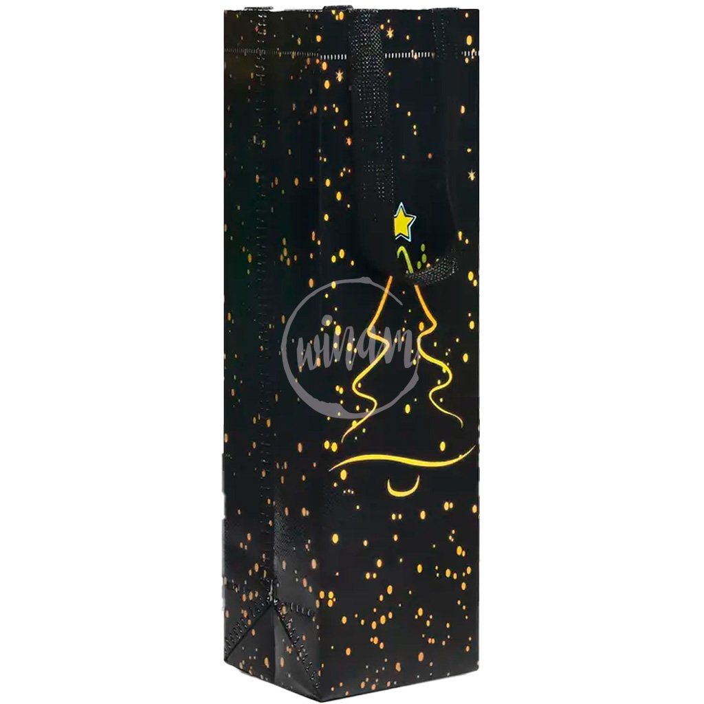 Dárková taška na víno v zářivé černé barvě se zlatým dekorem vánočního stromečku. Ouška jsou vyrobena z textilní stuhy. Rozměry: 35 x 10 x 9 cm. Vhodné pro všechny typy lahví.
