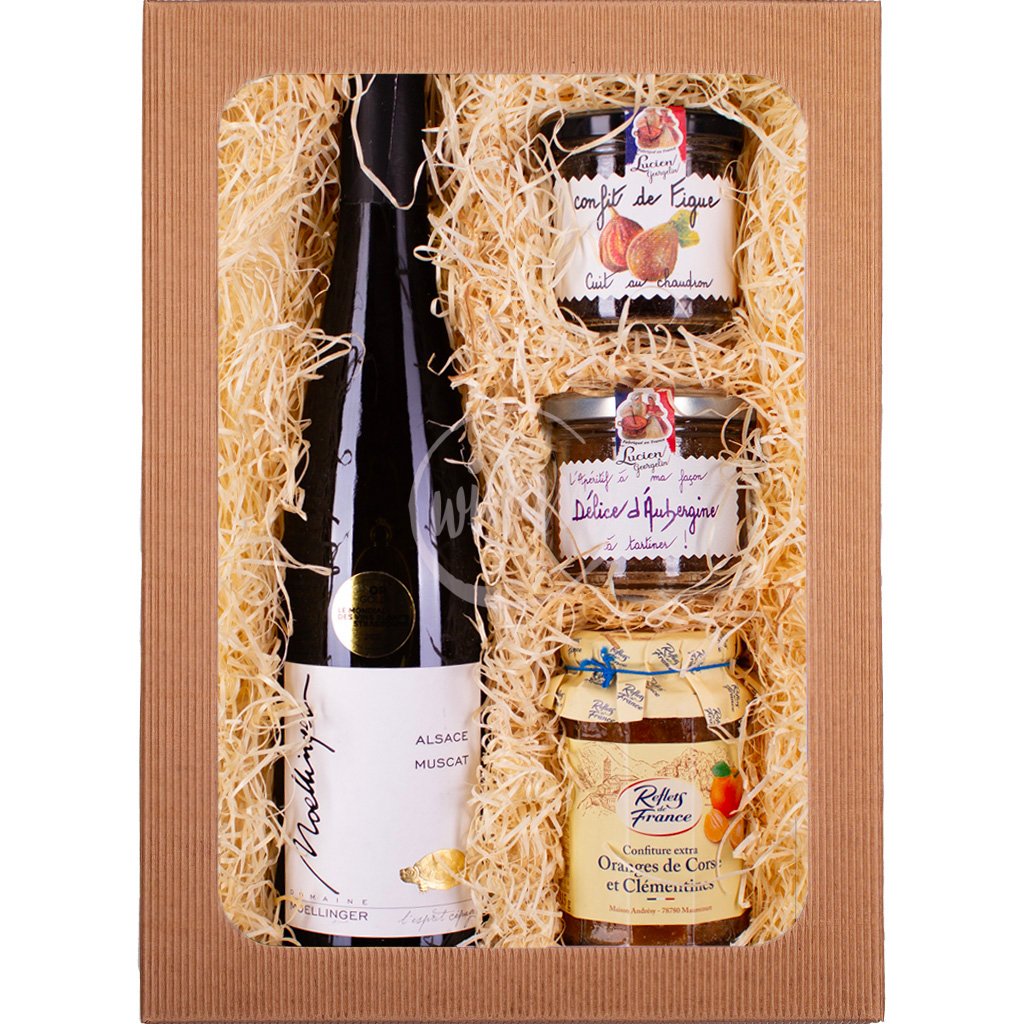 Lehké a šarmantní - to je víno z tradiční alsaské aromatické odrůdy Muscat z vinařství Domaine Moellinger nedaleko Colmaru. Víno se pyšní delikátní květinovou vůní muškátu, hlohu, sedmikrásek a marcipánu. V chuti je lehké, s ovocnými tóny broskví, limetky a zeleného čaje. Nabízíme v dárkovém balení s karamelovým krémem se slaným máslem a s lahodnou marmeládou z pomerančů a mandarinek z Korsiky. Skvělý dárek pro mlsné jazýčky.