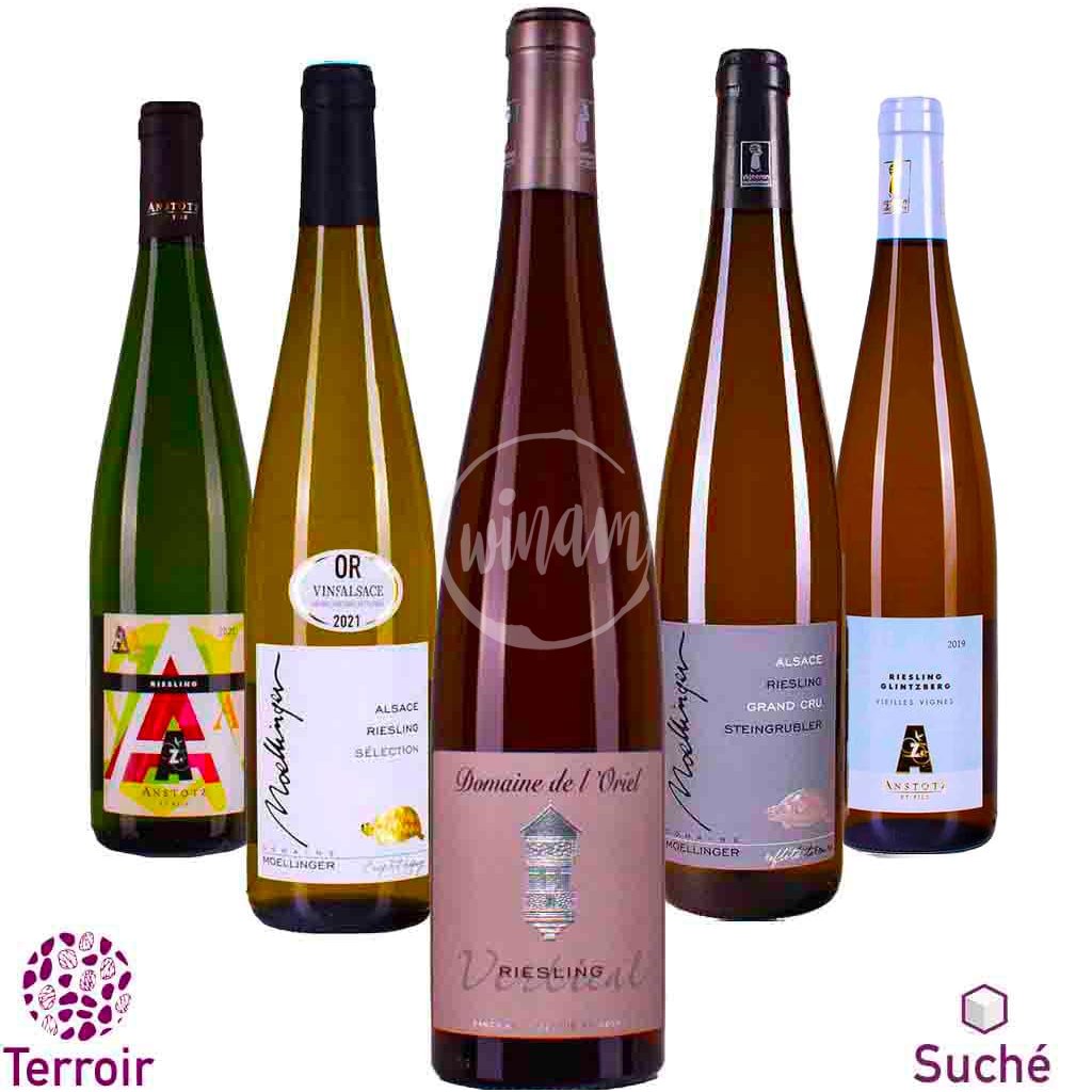 Znamenitý degustační balíček, který vás provede různými podobami odrůdy Riesling, která je králem prosluněných vinic Alsaska. Balíčku dominuje harmonický Riesling "Vertical" s vyváženou chutí ovoce, koření a minerálů, který pochází ze strmých žulových jižních svahů Domaine de l'Oriel. Dalším zástupcem je ušlechtilé Grand Cru Steingrubler, plné kulatých ovocných chutí, dále sympatický Riesling z vinic nedaleko Colmaru s vůní ovoce a medu, svěží citrusový Riesling z Domaine Anstotz nedaleko Strasbourgu a degustační jízdu uzavře minerální Riesling z viničních parcel, pokrytých opukou se zbytky mušlí. Jeho aroma je velmi intenzivní, s minerálními tóny křemene. Atraktivní degustační balíček pro radost a poznání milovníků suchých bílých vín a Rieslingů zvláště.