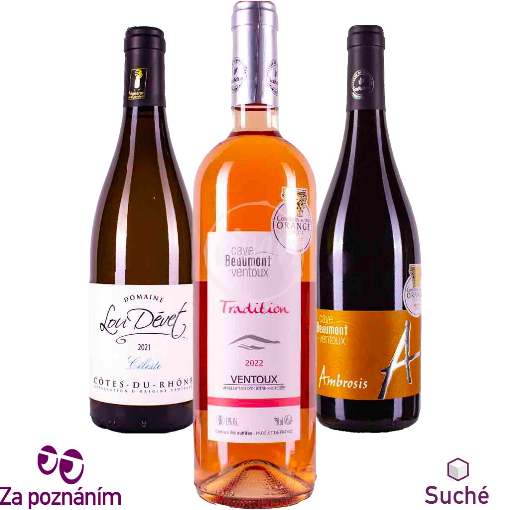 Degustační balíček vín tří barev vás provede typickými odrůdami a styly vín této významné a rozlehlé vinařské oblasti. Stylové červené a růžové víno pochází z výše položených vinic na úpatí hory Ventoux, které jsou chráněné UNESCO. Červené víno se vyznačuje sametovými kulatými tříslovinami a sladkou chutí povidel a zralého ovoce, zatímco růžové víno je svěží, plné ovoce a tónů sladkých pekařských dobrot. Trojici doplňuje bílé cuvée z vinařství v sousedství Châteuneuf-du-Pape, které se pyšní líbeznými tóny květů a sladkého peckového ovoce. Užijte si elegantní bohatá vína z tradičních rhônských odrůd za skvělou cenu!