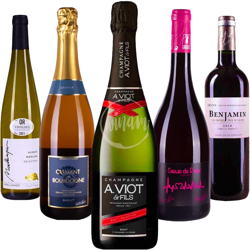 - Pořadí degustace: 1. Crémant de Bourgogne, 2. Champagne Sélection, 3. Riesling Sélection, 4. Coeur de R'Oze, 5. Graves Rouge