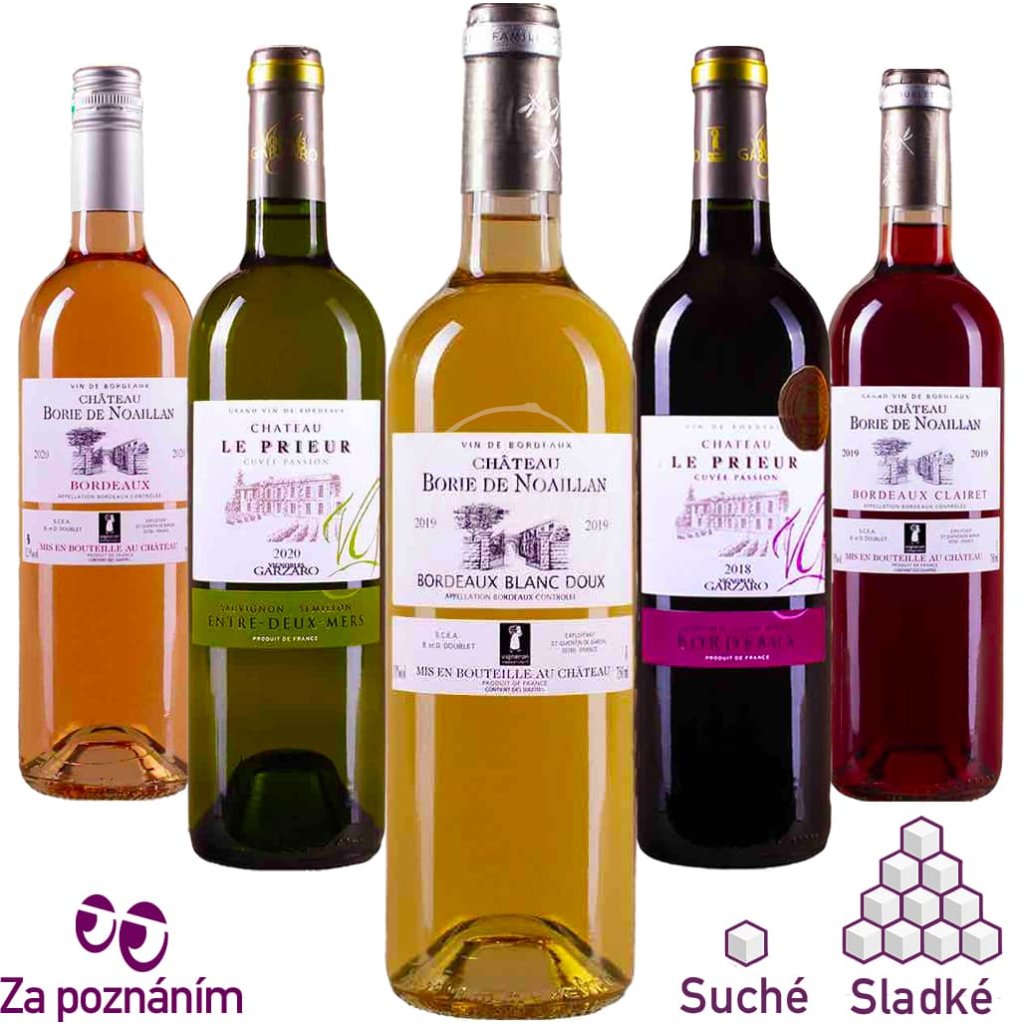 Tento skvělý degustační balíček vám představí vína z Bordeaux všech barev a provede vás tradičními odrůdami a styly vín této slavné vinařské oblasti. V balíčku najdete aromatické bílé cuvée z odrůd Sémillon, Sauvignon Blanc a Muscadelle - jednou ve verzi suchého a jednou sladkého vína. Dále se představí lehké ovocné rosé, vyrobené ze směsi tradičních odrůd, atraktivní specialitu bordeauxského regionu - sytě růžový Clairet, který představuje můstek od růžového k červenému vínu a samozřejmě klasické červené cuvée, vyrobené z typických odrůd oblasti. Skvělý degustační balíček pro radost a poznání.